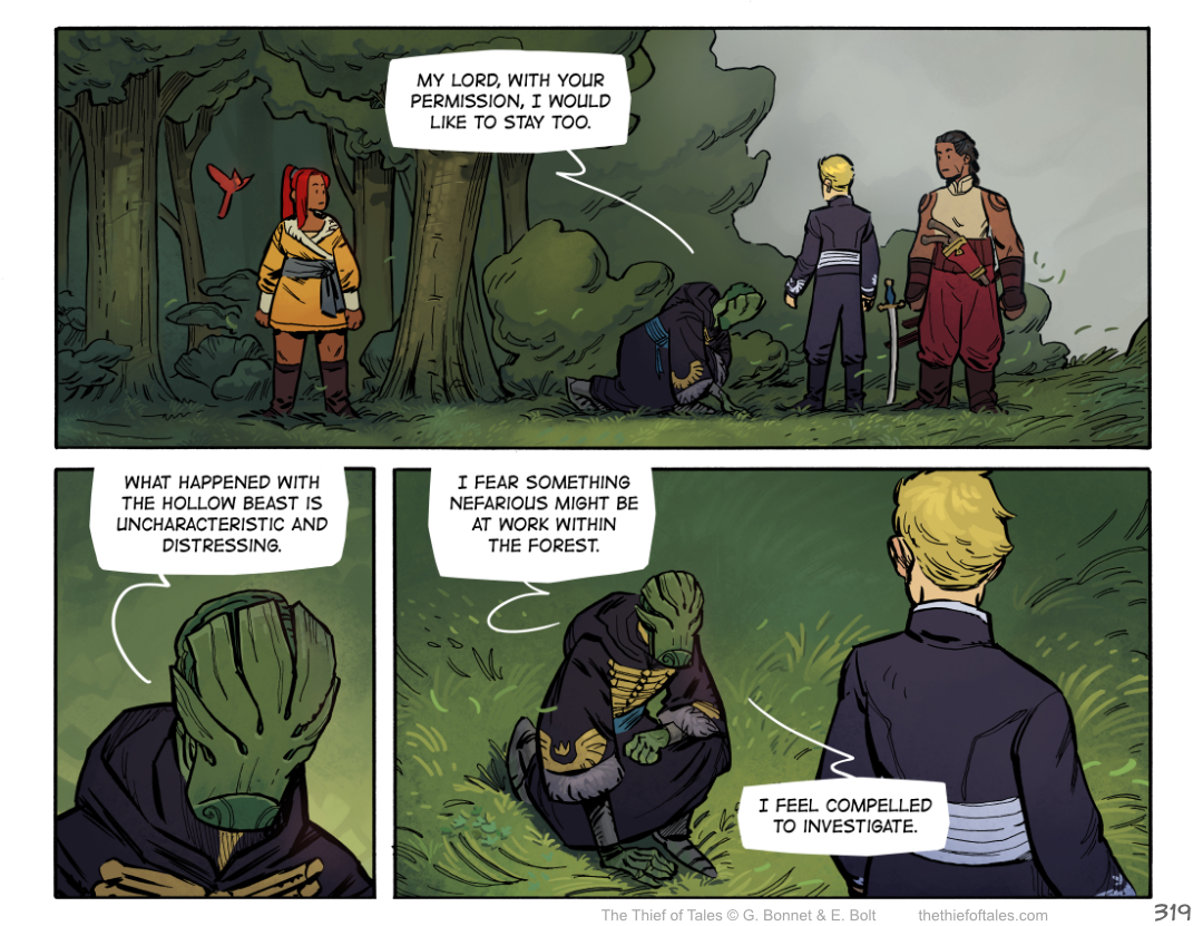 I’m also pretty sure we’ll see the re-appearance of Professor Firebolt and the Mages of the Paw who had chased off Sir Thorn when he was trying to take Nevhna in, first seen in page 129.